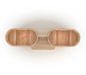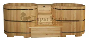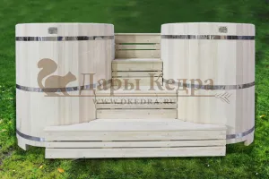 Двойная купель из кедра чаще всего используется в крупных банных комплексах и оздоровительных центрах. Она представляет собой две овальные чаши для воды, в которых люди отдыхают после парения. Между купелями установлен широкий подиум из кедра, по которому могут спускаться и подниматься сразу несколько людей. Для комфортного отдыха купель оснащена лавочками и двумя дополнительными лестницами. Обручи из нержавеющей стали декорируют изделие и равномерно распределяют нагрузку воды во время пользования. При правильном уходе купель для бани не рассыхается и не подвергается гниению.