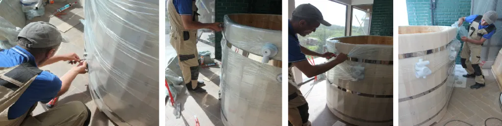 - Оставить купель до полного высыхания на 3 часа. После этого необходимо снять стяжные фиксирующие ремни и пленку. В местах склейки внутри и снаружи при необходимости убрать концелярским ножом остатки клея PUR, зашлифовать и нанести защитное покрытие, если изначально им была пропитана купель. И далее снова нанести пленку на изделие.